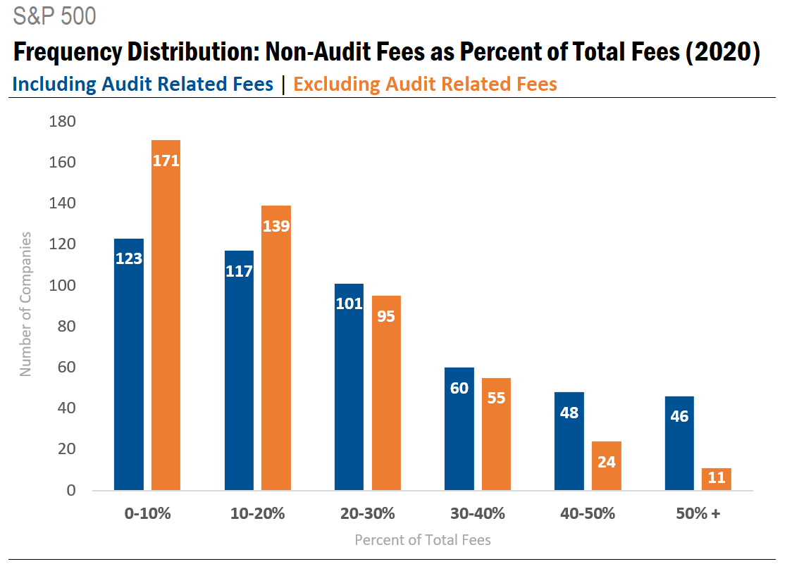 Nearly 63% of S&P 500 companies disclosed non-audit fees (including audit related) that were 20% or less of total fees in FY 2020. In comparison, our analysis of FY 2018 non-audit fees found 58% of S&P 500 companies paid non-audit fees comprising less than 20% of total fees.