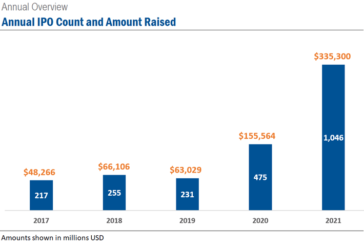 The total amount raised from IPOs more than doubled between 2020 and 2021, and more than quintupled between 2019 and 2021.