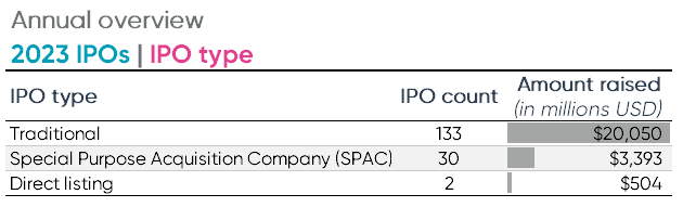 Traditional IPOs were the most common IPO type in 2023. There were 133 traditional IPOs that raised a combined total of $20 billion, averaging $150.7 million per offering. Compared to 2022, the number of traditional IPOs increased by 28% while total proceeds raised more than doubled.