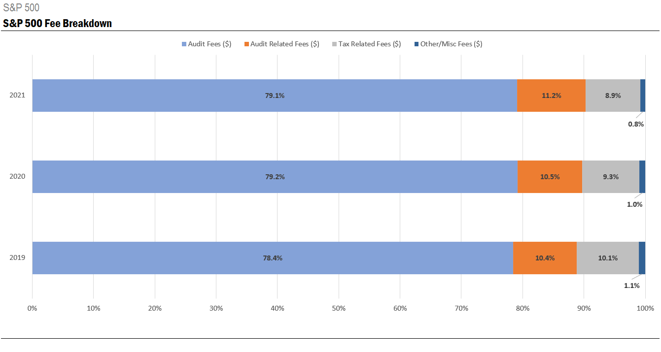 For a more granular look into fee categories, the chart below shows the percentage amounts each fee category contributed to total fees for the S&P 500 companies. Audit fees paid by the index provided 79.1% of total fees in 2021.
