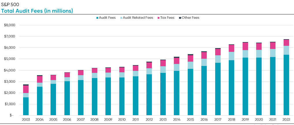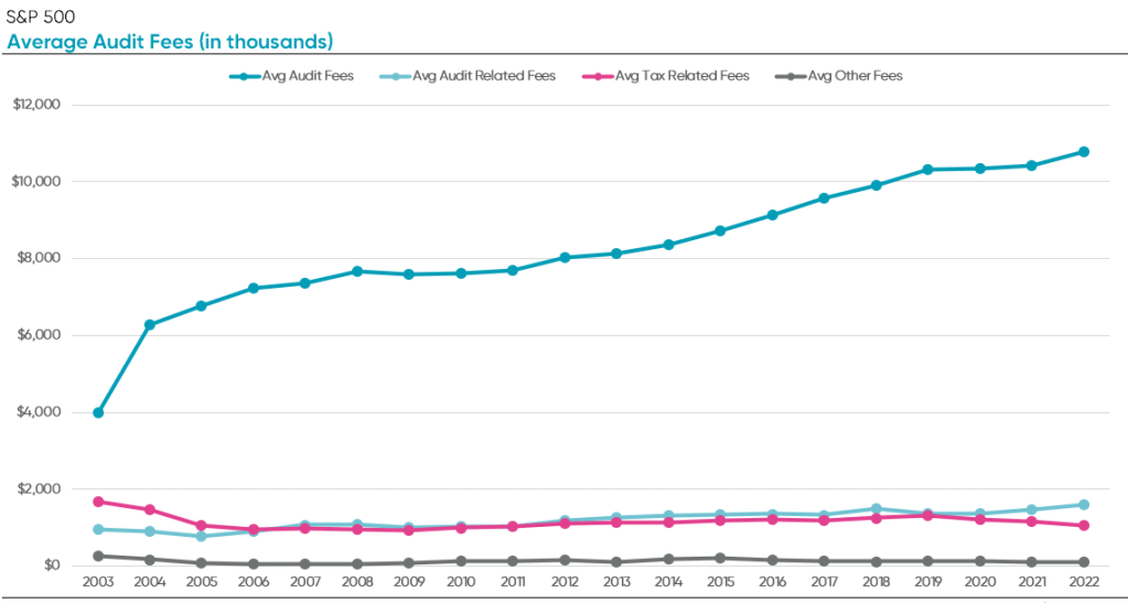 Average audit fees paid by S&P 500 companies reached an all-time high in FY2022 at $10,776,916 – representing a 3% increase from FY2021. Apart from FY2009, average audit fees have been steadily increasing since 2003.