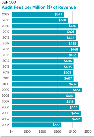 Although both total audit fees and revenue increased in FY2022, revenue grew at a much greater rate. Revenue increased 12% for the S&P 500 in FY2022, while audit fees paid grew by only 4%. As a result, audit fees per million dollars of revenue dropped to $343 in FY2022. This represents a 7% decrease from FY2021, following the steepest decline of 15% between FY2020 and FY2021.