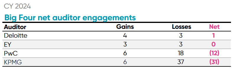 Overall, there were 161 engagements and 172 departures during 2024 among the Big Four and major global and national firms. Five of the top firms had net gains while the other six experienced net losses.