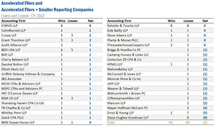 eloitte was the leader for new large accelerated filer clients in 2022, gaining a net of seven clients throughout the year. FORVIS followed with three new clients. BDO saw the most net losses, losing seven large accelerated clients in 2022.