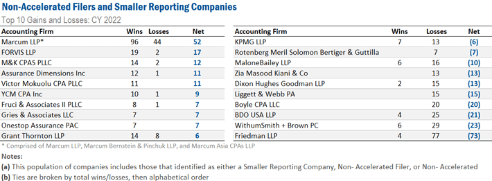 Marcum saw the most net gains among non-accelerated filers and smaller reporting companies for 2022 with 52 new clients. FORVIS followed with 17 net clients and M&K CPAs ranked third with a net of 12 clients.