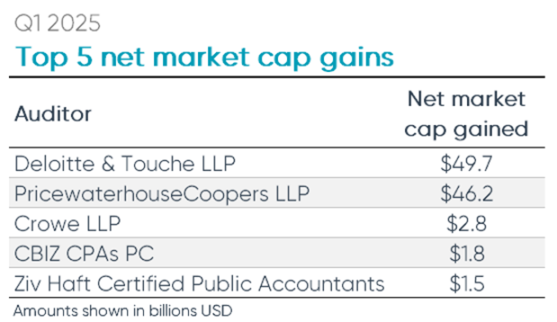 Deloitte had the largest net market cap gains from their Q1 2025 audit clients at $49.7 billion. Their largest client by far was Dexcom Inc., which boasts a market cap of over $30 billion. The company is an international medical device manufacturer and was previously audited by Ernst & Young.