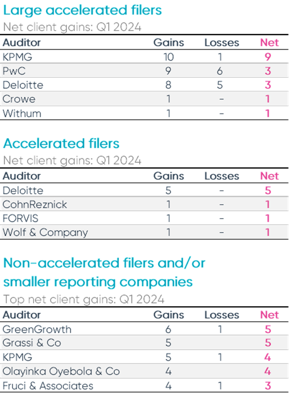 KPMG gained the most large accelerated filer clients for the second consecutive quarter with a net gain of nine clients in Q1 2024. Deloitte led for accelerated filers, adding five new clients during the quarter. For non-accelerated filers, GreenGrowth and Grassi & Co each saw a net gain of five clients during the quarter.