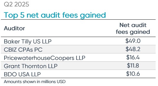 Marcum, for the second quarter in a row, had the most net audit client losses in Q2 with 141 departures. Marcum’s losses this quarter were a result of the merger with CBIZ CPAs, who engaged 124 of these clients.