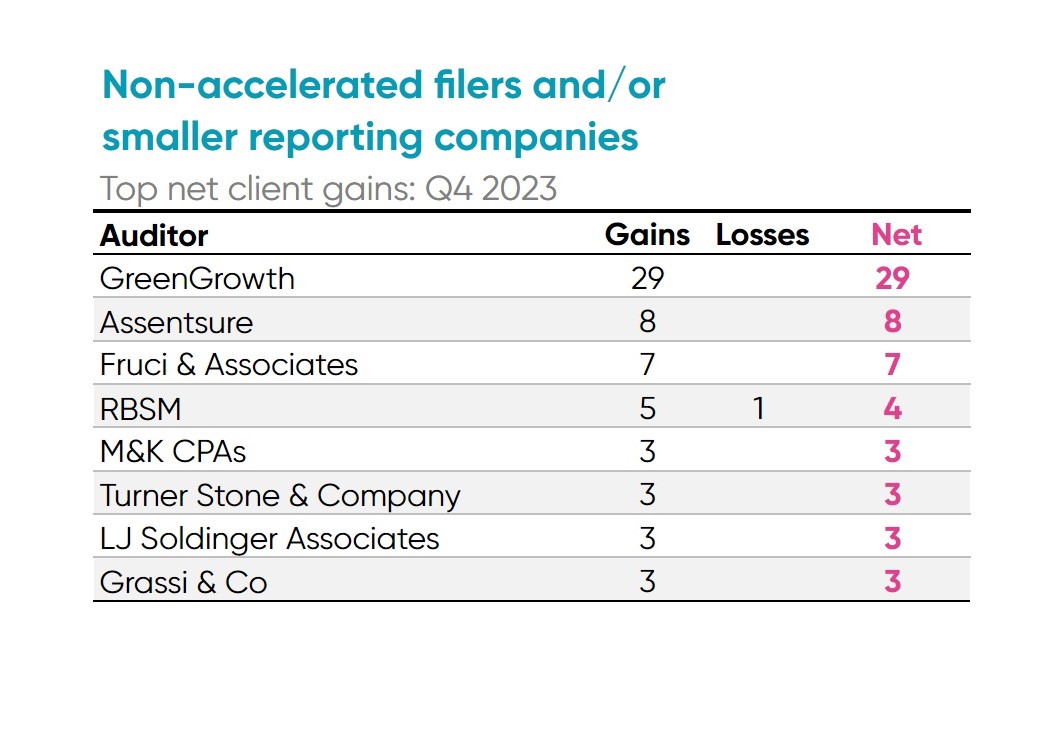 - GreenGrowth dominated the non-accelerated filer and smaller reporting company market with 29 new clients, largely gained as a result of their previously mentioned mergers.
