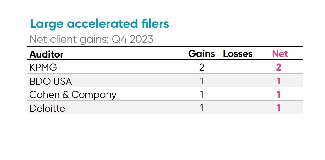 - KPMG gained the most large accelerated filer clients in Q4 with two new clients.