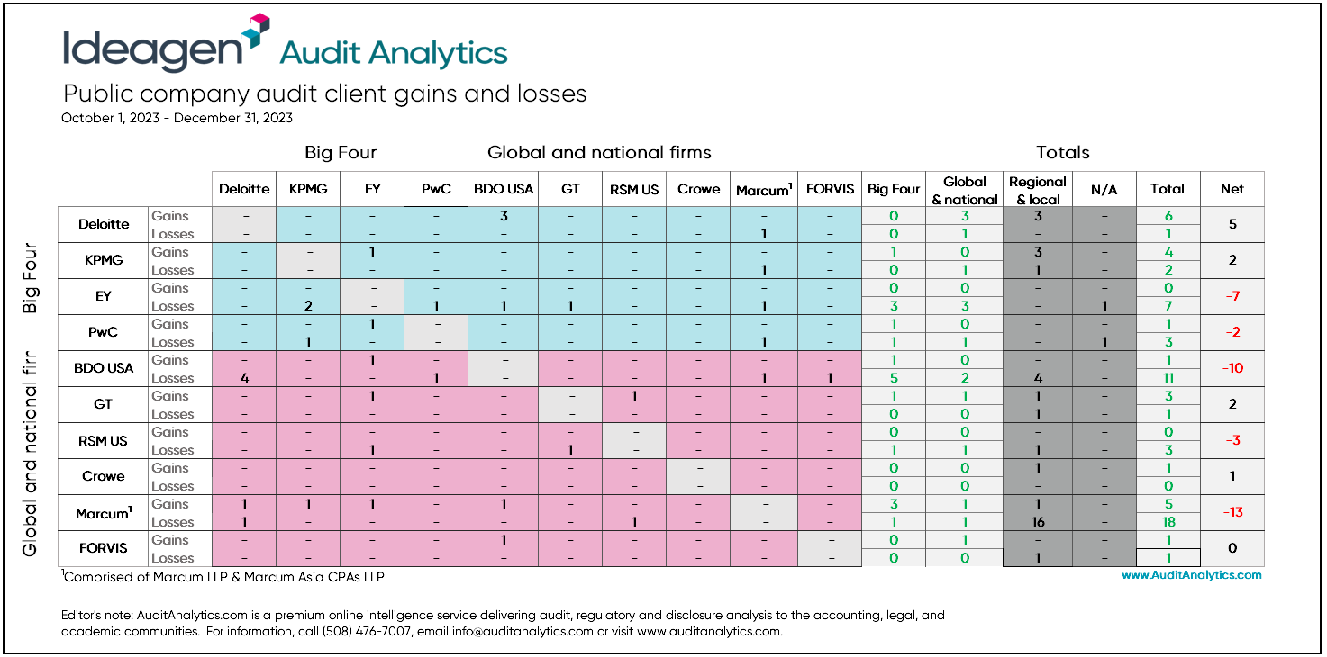 Overall, the top ten global & national audit firms gained 22 and lost 47 clients during Q4 2023.