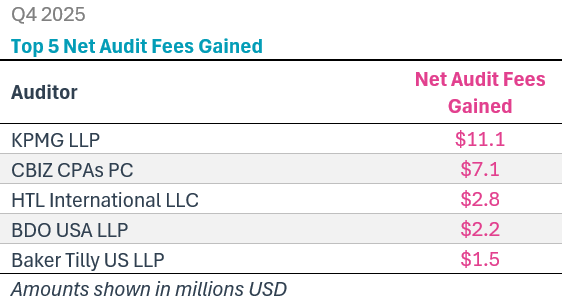 KPMG also led in net audit fees gained with $11.1 million in the fourth quarter. CBIZ CPAs PC followed with $7.1 million in net audit fees gained, reflecting continued momentum from its November 2024 acquisition of Marcum's attest business. HTL International LLC gained $2.8 million in net audit fees, while BDO USA LLP added $2.2 million. Baker Tilly US LLP, who merged with Moss Adams in June of 2025, completed the top five with $1.5 million in net audit fees gained.