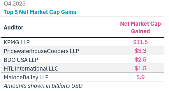 PricewaterhouseCoopers gained clients with a net market capital of $3.3 billion, followed by BDO USA LLP at $2.5 billion. HTL International LLC gained clients with $1.5 billion in market capital, while MaloneBailey LLP rounded out the top five with $0.9 billion.
