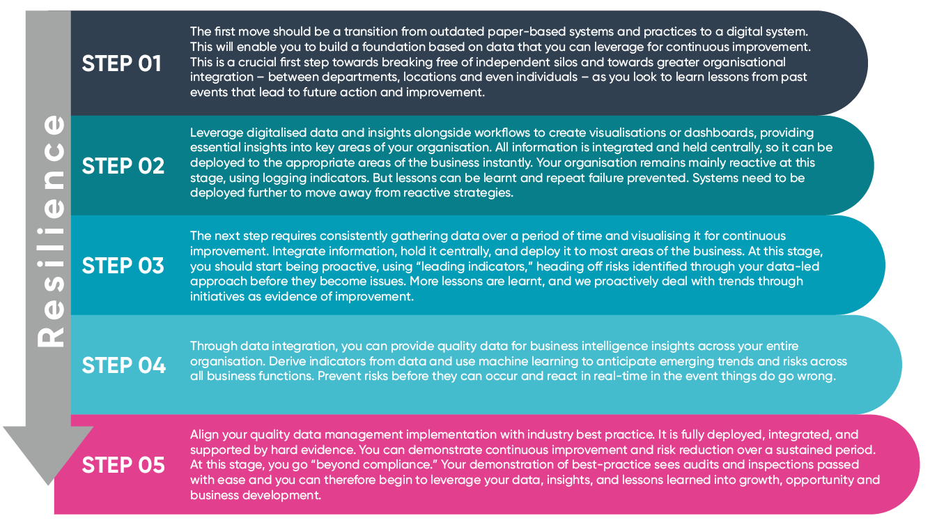 So, how can quality management become a strategic driver in your organization? There are five steps towards establishing a quality management system that builds true resilience. You may already find you are one or two steps along the process, but to build true organisational resilience, the fifth step should be the goal.