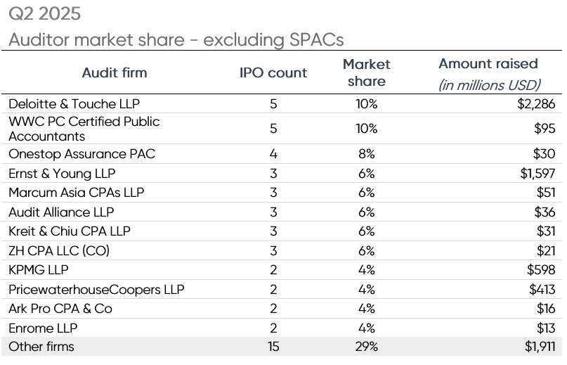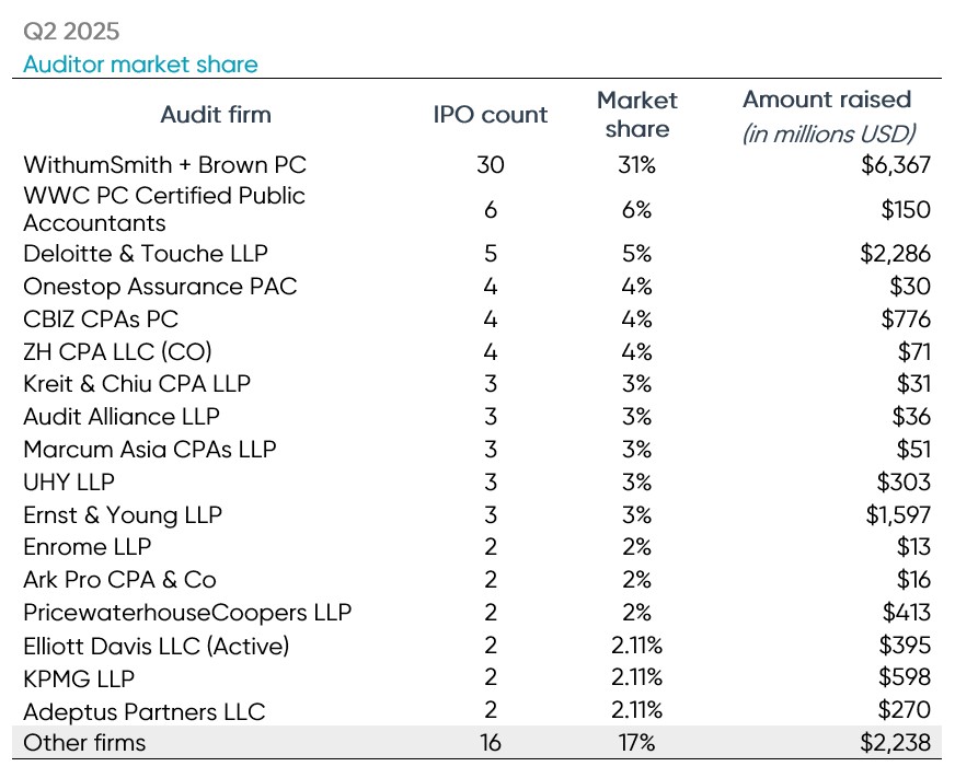 There were 33 different firms that audited the newly listed companies in Q2 2025. WithumSmith + Brown again led all auditors in terms of total IPO client count with 30 new IPO clients. Withum individually represented 31% of all Q2 2025 IPOs. WWC PC Certified Public Accountants trailed Withum with six IPOs audited, while big four member Deloitte audited the most clients with five IPOs.