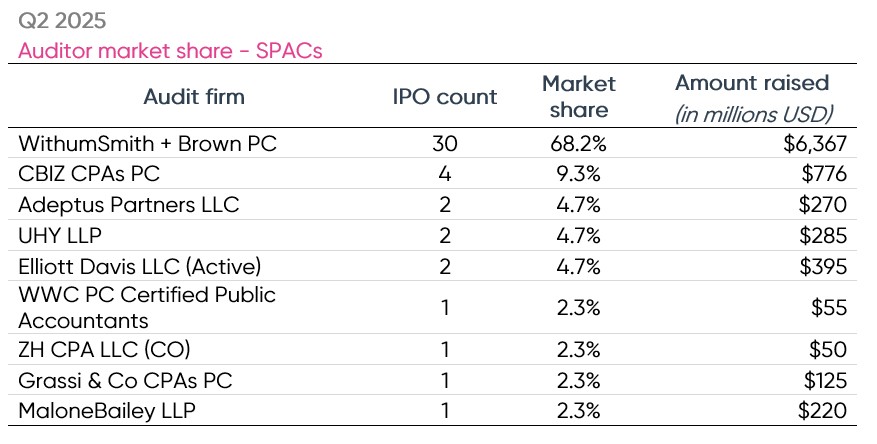 Twenty-seven different firms audited the 52 SPAC IPOs of Q2 2025. Withum, once again, was the dominant player in the SPAC IPO market, auditing 30 SPAC IPOs this quarter Withum’s SPACs and raised a combined total of $6.4 billion in proceeds. Withum accounted for 68% of the SPAC IPO market share this quarter. Second was CBIZ, who acquired the former leader, Marcum, and audited 4 SPAC IPO’s.