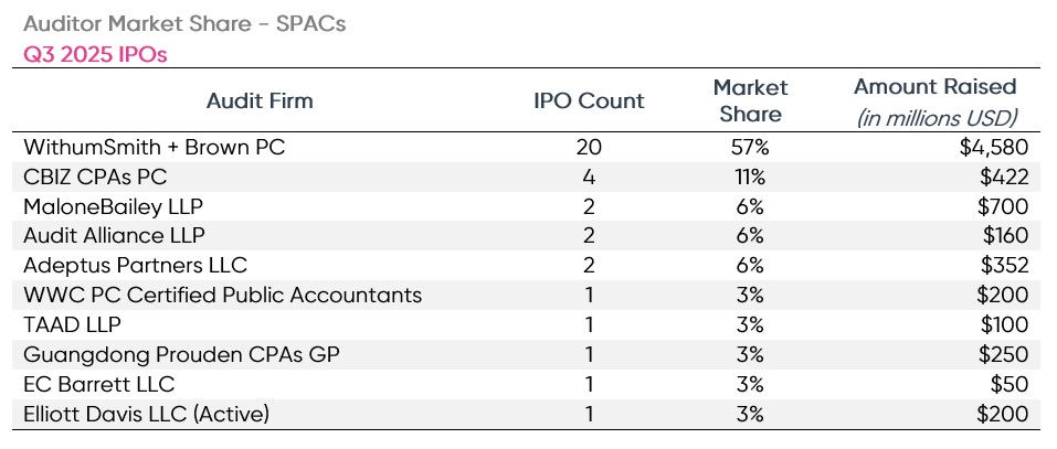 Ten different firms audited the 35 SPAC IPOs of Q3 2025. Withum, once again, was the dominant player in the SPAC IPO market, auditing 20 SPAC IPOs this quarter. Withum’s SPACs and raised a combined total of $4.6 billion in proceeds and accounted for 57% of the SPAC IPO market share this quarter. Second was CBIZ, who acquired the former leader, Marcum, and audited 4 SPAC IPO’s.