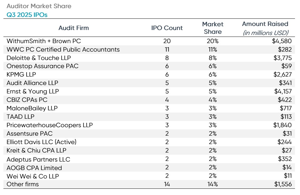 There were 31 different firms that audited the newly listed companies in Q3 2025. WithumSmith + Brown again led all auditors in terms of total IPO client count with 20 new IPO clients. Withum individually represented 20% of all Q3 2025 IPOs. WWC PC Certified Public Accountants trailed Withum with 11 IPOs audited, while big four member Deloitte was third with eight IPOs.