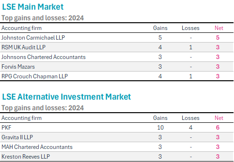 For the third year in a row, PKF gained the most overall clients listed on the London Stock Exchange (LSE). In 2024, however, PKF gains of 15 new clients were offset by losses of 11, resulting in a net gain of 4 clients during the year. On a net basis, Johnston Carmichael LLP and Kreston Reeves LLP topped the list with a net of five client gains and no losses reported.