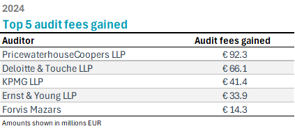 Deloitte followed closely with €66.1 million in audit fees incurred from their new LSE clients in 2024. KPMG ranked third with €41.4 million in audit fee gains, while Ernst & Young gained €33.9 million in audit fees from new clients.