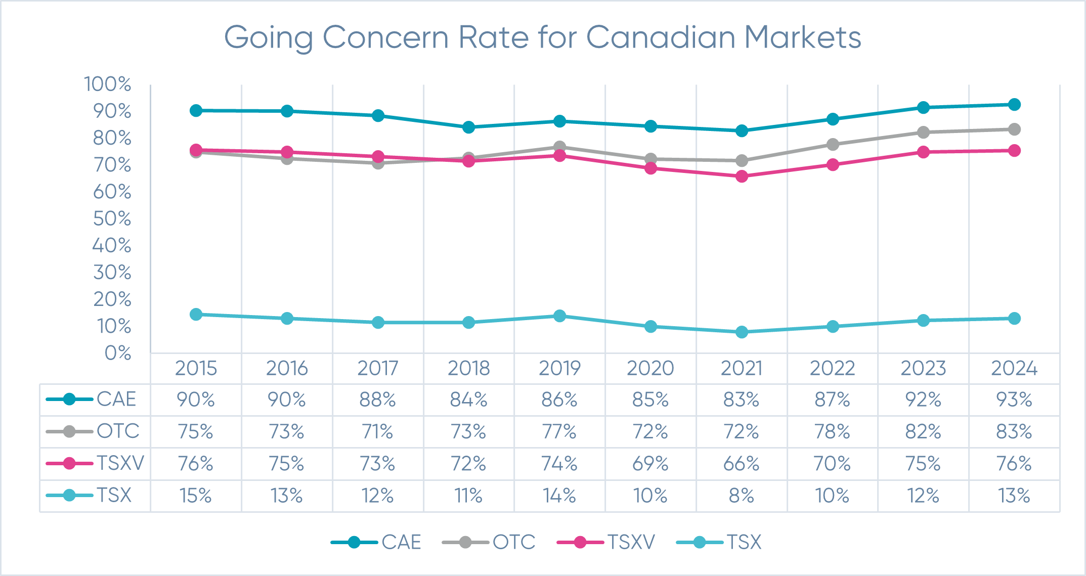 The numbers are far higher when we strip out the companies that have a registration but for which the Canadian exchanges are not their primary exchange. The chart below shows the going concern rates of the subset of companies that have an active primary listing on the main exchanges: Toronto Stock Exchange (TSX), TSX Venture (TSXV) and the Canadian Securities Exchange (CSE) as well as the OTC markets (OTC):