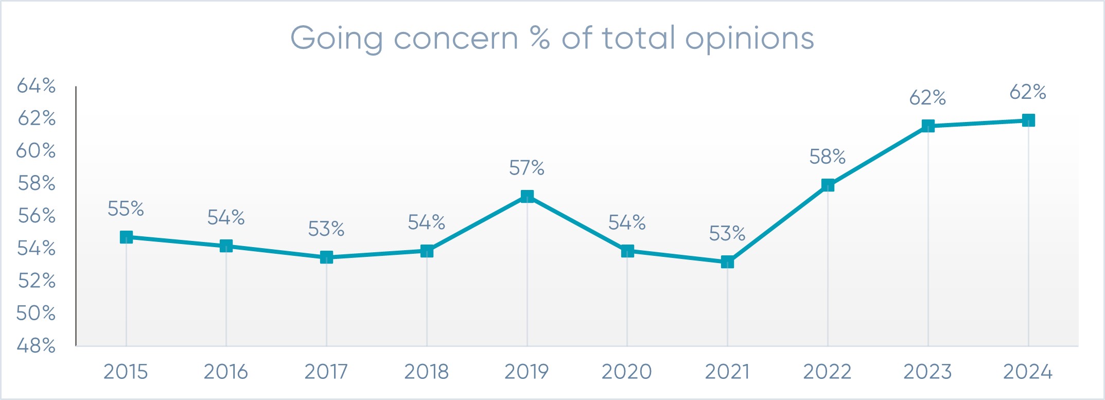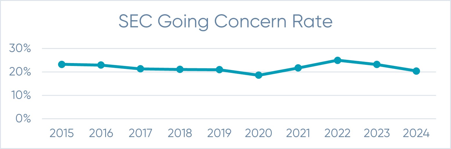 The comparable rate for SEC opinions in our latest report on Going Concerns (INSERT LINK HERE) for FY2024 was 20% and the trend was as follows:
