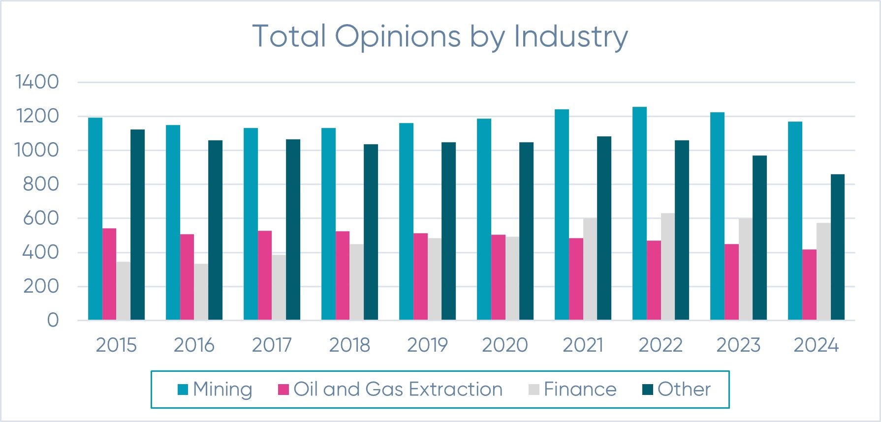 The mix of companies in Canada is quite different between exchanges and overall is quite different from what we see in our SEC analysis. The top three industries on the Canadian exchanges for Going Concern opinions make up 71% of all FY2024 opinions:
