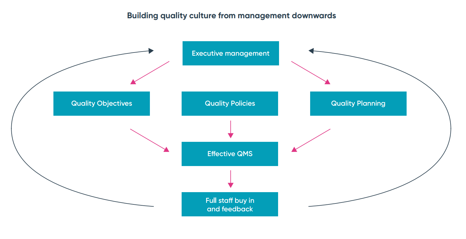In essence, quality ideally needs to be embedded in an organization from top to bottom. It’s not enough to expect buy in from staff throughout the organization just simply by implementing a system. There needs to be a top management commitment to quality to ensure that buy in.